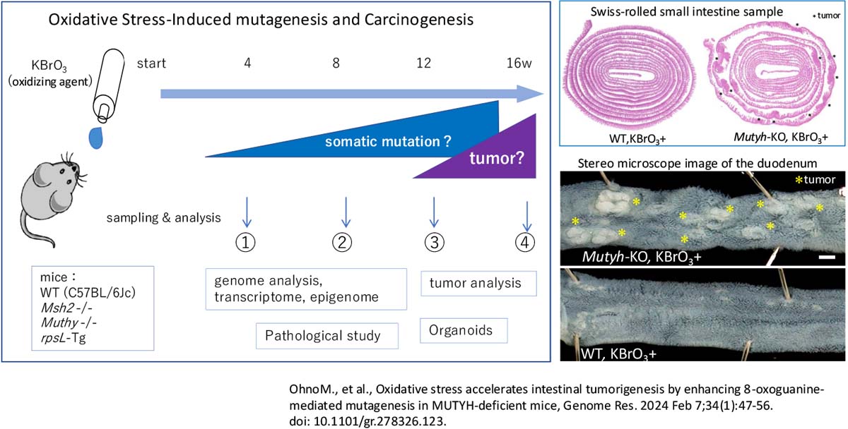 This project aims to elucidate the mechanisms of carcinogenesis caused by oxidative DNA damage and defects in its repair system. Using knockout mice for genes such as Mutyh and Msh2, which are known as causative genes of hereditary colorectal cancer, we are investigating the relationship between oxidative stress, mutagenesis, and carcinogenesis.