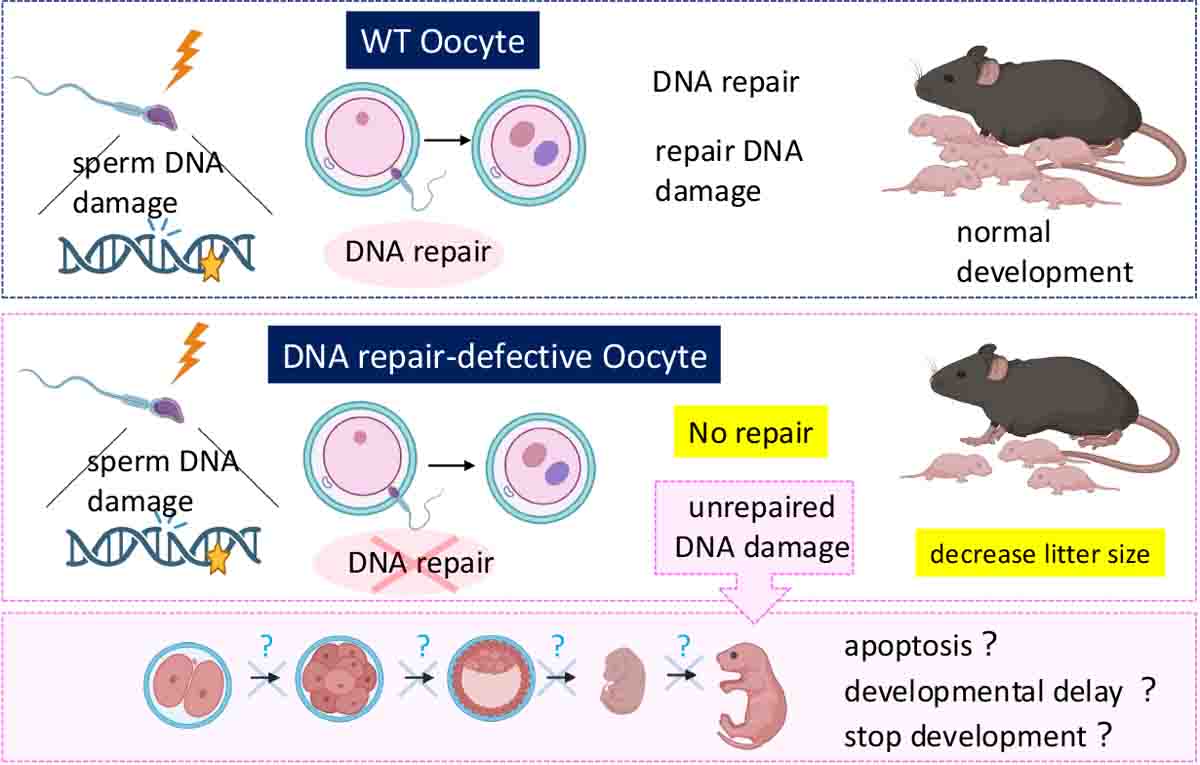 Sperm DNA damage is recognized as a risk factor for infertility and miscarriage, while the oocyte’s DNA repair mechanisms are suggested to contribute to normal embryonic development. This study aims to elucidate the underlying mechanisms by using DNA repair-defective mice.