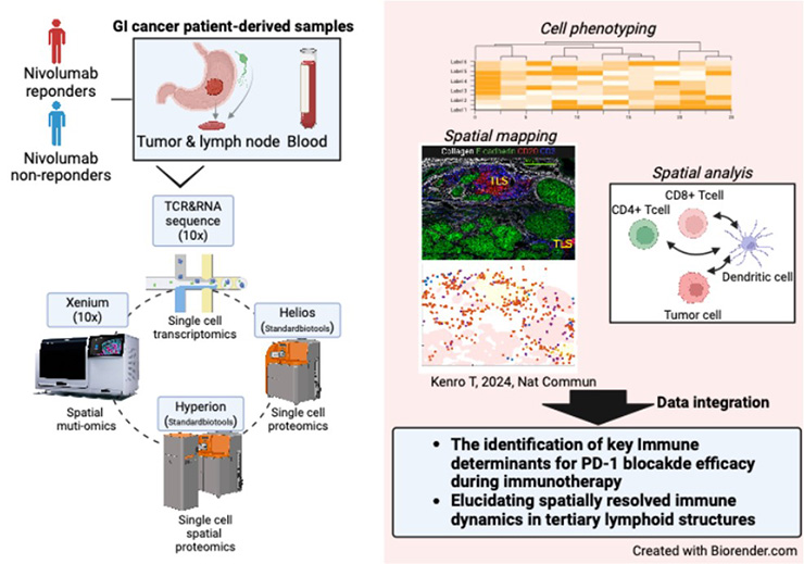 Specifically, we perform spatial transcriptomics analysis using Xenium (10x Genomics) and T cell repertoire analysis using single-cell TCR and RNA sequencing (10x Genomics). Furthermore, to comprehensively profile immune responses in solid tumors and peripheral blood, we conduct spatial proteomics using the Hyperion Imaging System (Standard BioTools) and single-cell proteomic analysis using the Helios Mass Cytometer (Standard BioTools). Through these approaches, we have identified novel CD8⁺ T cell subsets associated with clinical responses to cancer immunotherapy (Kenro T, 2024, Nature Communications).