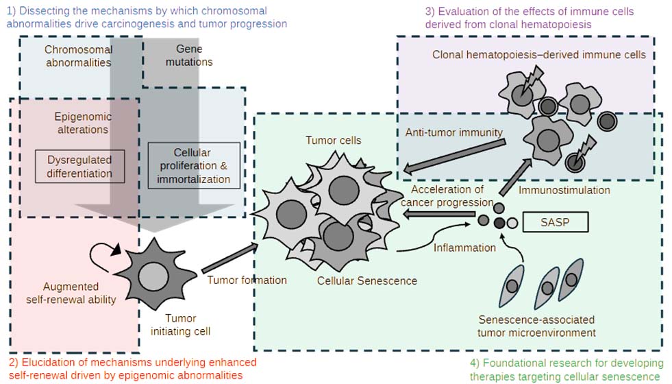 We aim to elucidate the mechanisms of cancer initiation and progression from multiple perspectives, including cancer-initiating (stem) cells, epigenomic alterations, chromosomal abnormalities, clonal hematopoiesis, and cellular senescence, and to develop novel therapeutic approaches based on these insights. In particular, we pursue translational research bridging basic and clinical studies, such as investigations into differentiation defects of colorectal cancer stem cells, the relationship between clonal hematopoiesis and the tumor microenvironment, and the development of senolytic-based cancer therapies. Progress in these studies is expected to enable more effective treatments for cancer patients and to represent an important step toward overcoming cancer.